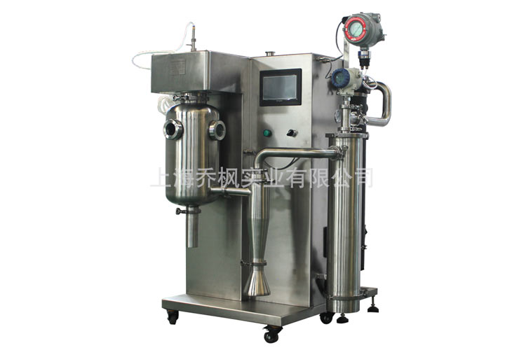 實驗型閉式噴霧干燥機采用菜單式微處理控制器,可以直接設置進口溫度、氣流量、自動通針頻率、蠕動泵速,實現數據采集以及過程監控和控制。自吸蠕動泵將樣品液體從容器中通過噴嘴進入干燥腔,同時壓縮空氣從外層套管進入干燥腔使液體微?;瑹峥諝鈴纳蠈舆M入與噴霧后的液體微粒相遇,物品開始干燥,干燥后的粉粒通過旋風分離器與廢氣分離后進入收集瓶中,廢氣則通過直徑軟管直接排到大氣或空氣過濾裝置。實驗型閉式噴霧干燥機主要適用于高校、研究所和食品醫藥化工企業實驗室生產微量顆粒粉末,對所有溶液如乳濁液、懸浮液具有廣譜適用性,實驗型閉式噴霧干燥機適用于對熱敏感性物的干燥如生物制品、生物農藥、酶制劑等,因所噴出的物料只是在噴成霧狀大小顆粒時才受到高溫,故只是瞬間受熱,能保持這些活性材料在干燥后仍維持其活性成份不受破壞。