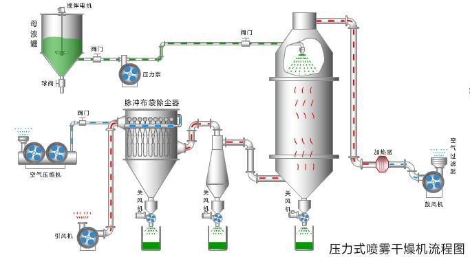 力噴霧干燥塔工作原理如下:通過2-20MPa的高壓將液料(經(jīng)過過濾的液料)送入壓力式霧化器霧化成小液滴,經(jīng)過霧化后的液滴(表面積大大增加)與熱空氣充分接觸,在10-30秒內(nèi)迅速完成干燥過程。得到粉體或細小顆粒的成品。