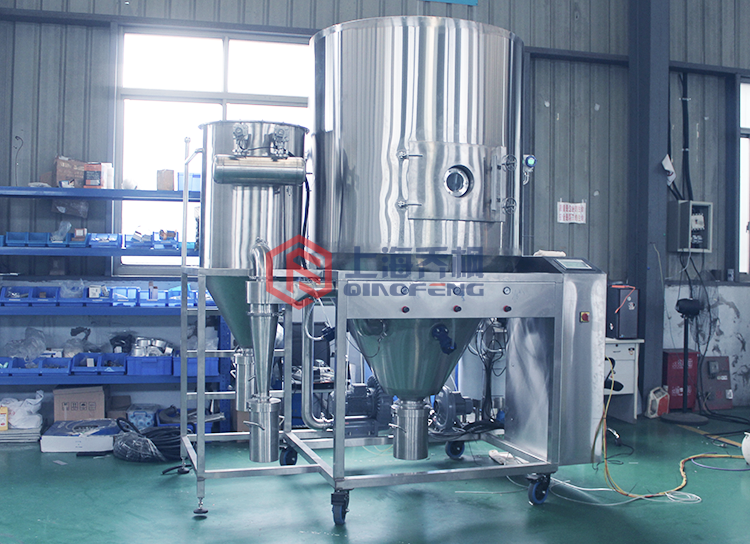 空氣經過過濾和加熱器,進入干燥室頂部空氣分配器,熱空氣呈螺旋狀均勻地進入干燥室。料液經塔體頂部的二流體霧化器或高速離心霧化器,(旋轉)噴霧成極細微的霧狀液珠,與熱空氣并流接觸,在極短的時間內可干燥為成品。成品連續地由干燥塔底部和旋風分離器中輸出,廢氣由風機排空。